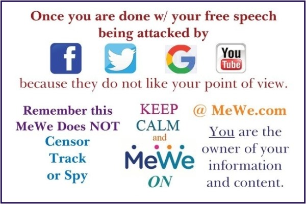 Mark Weinstein Admin ZDNet: "Have Issues with Facebook? MeWe Surges to 9 Million Members" 📈 MeWe Friends, The MeWe Movement is here! 🥁 The world is waking up to the fact that Facebook, Twitter and the other social media giants spy on, target, and manipulate their users and newsfeeds.👎 These giants are even censoring good, harmless users and posts simply for... Continue Reading →