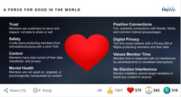 Awesome MeWe Members, Current social networks sell our data π π½β, destroy our privacy π , manipulate our minds and newsfeeds π€―, and disrupt our democracies with election interference. ππ½ MeWe solves ALL of these problems. βοΈ It's pure, honest, fun social networking, built on Trust, Control, Data Privacy and Love. π€β€π― MeWe is a Force for Good in the World. Here are 8... Continue Reading →